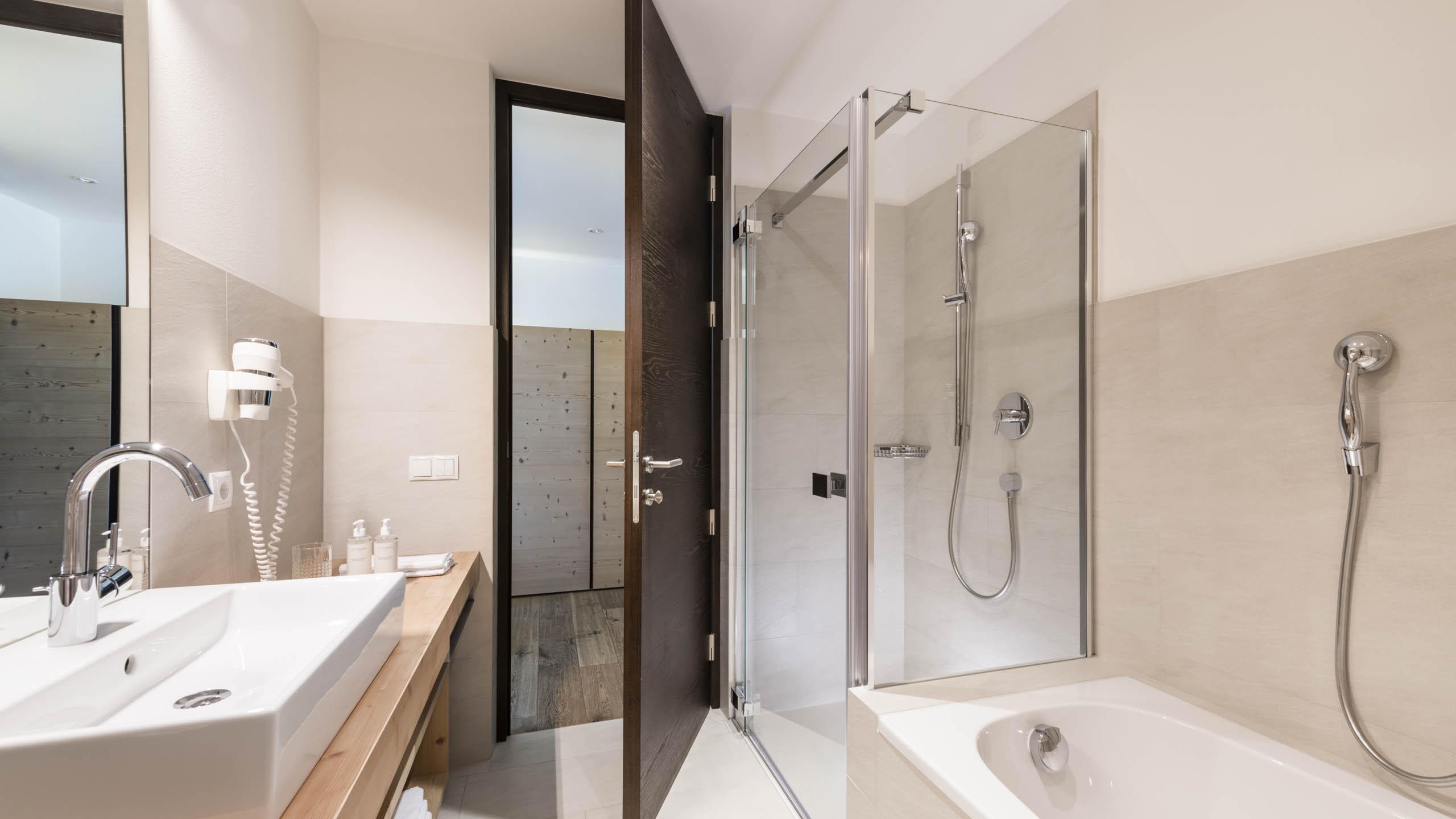 The “Design” double room includes a bedroom with double bed and sofa, a bathroom with shower and bathtub, bidet, and hairdryer as well as a balcony or terrace facing the walkway. The room has wooden flooring, high-quality furniture and is equipped with a satellite TV, internet connection, an autonomous air circulation system, a phone, and a safe.