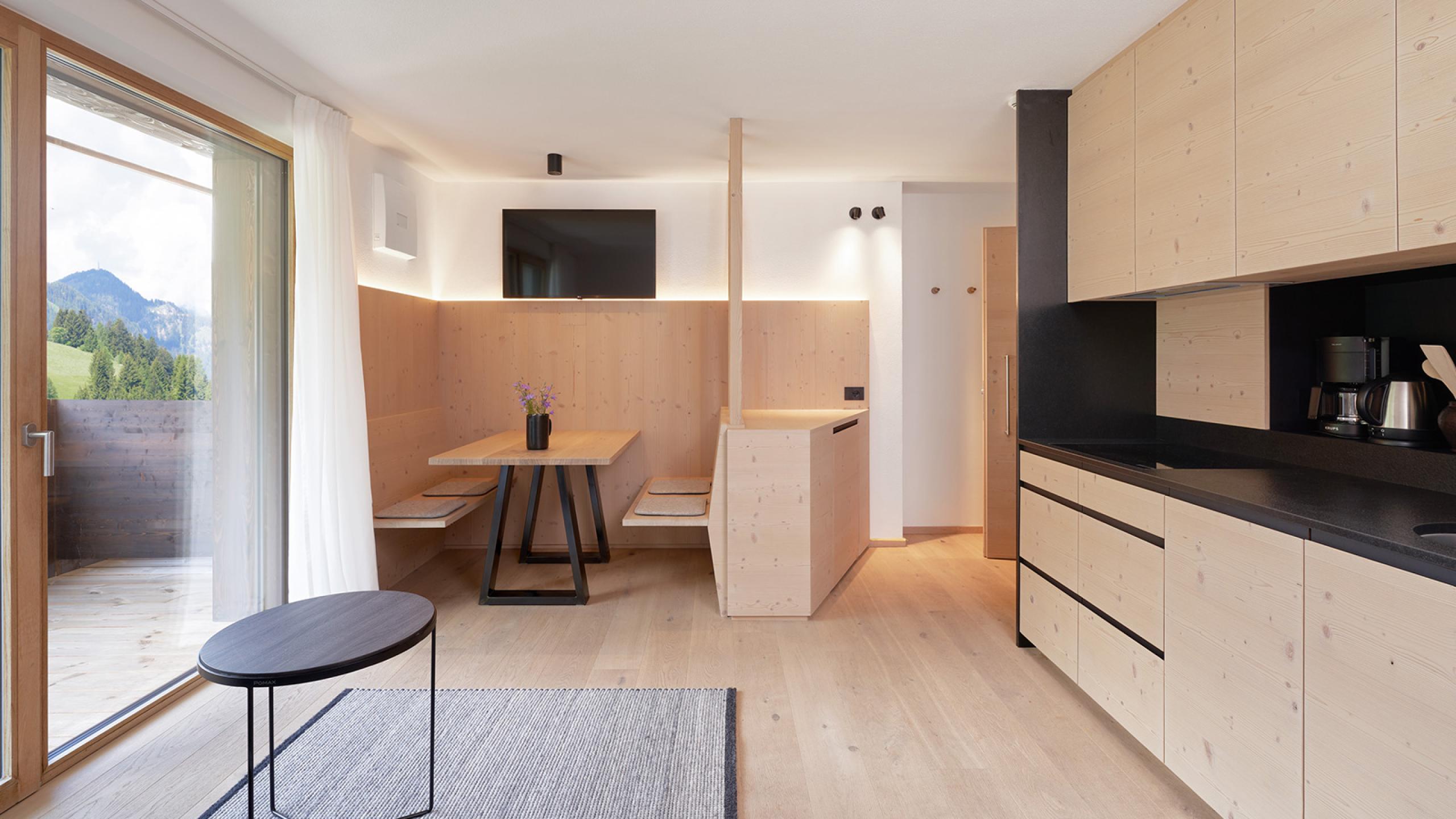 The two-room “Art” apartment consists of an open-plan living room with a pull-out sofa and dining area, a bedroom with double bed, and a balcony. The kitchenette is equipped with a ceramic hob, dishwasher, fridge with freezer, kettle, and filter coffee machine. The living room and bedroom have oak flooring and a satellite TV each, as well as an autonomous air circulation system, internet connection, phone, and safe. The bathroom includes a shower, bidet, and hairdryer. Bed linen, towels, and tea towels are provided.