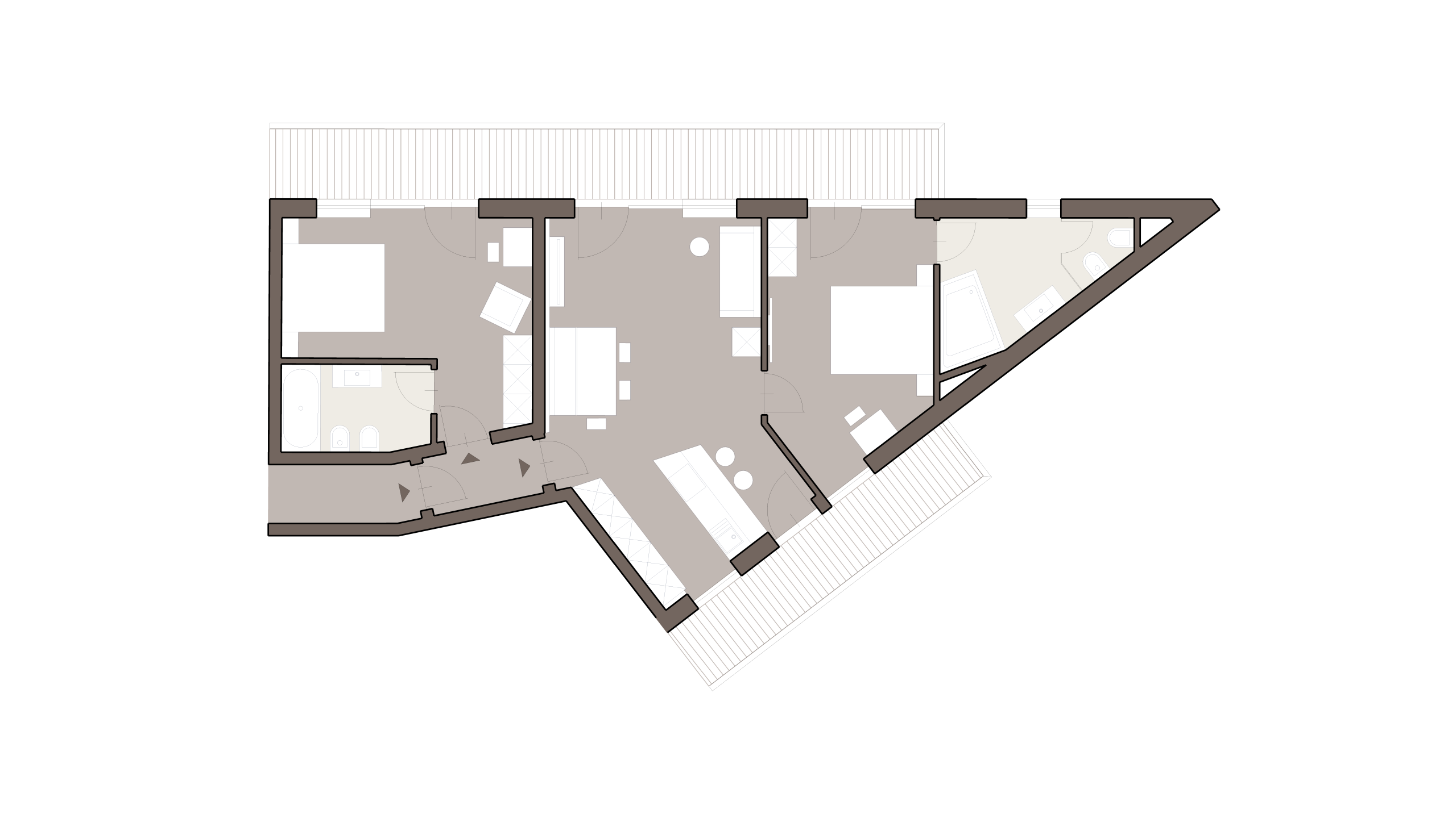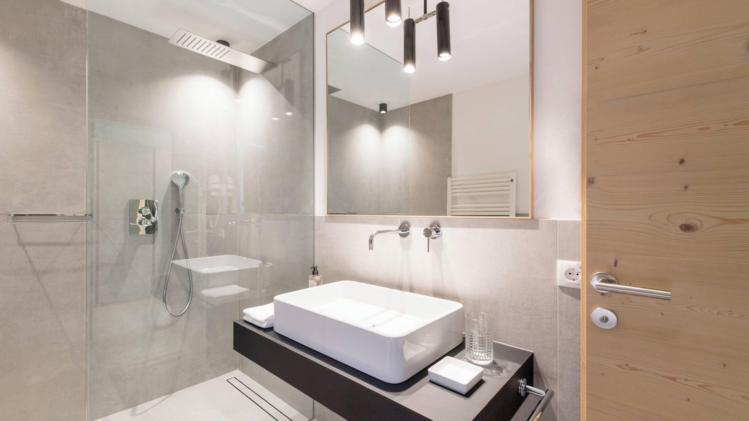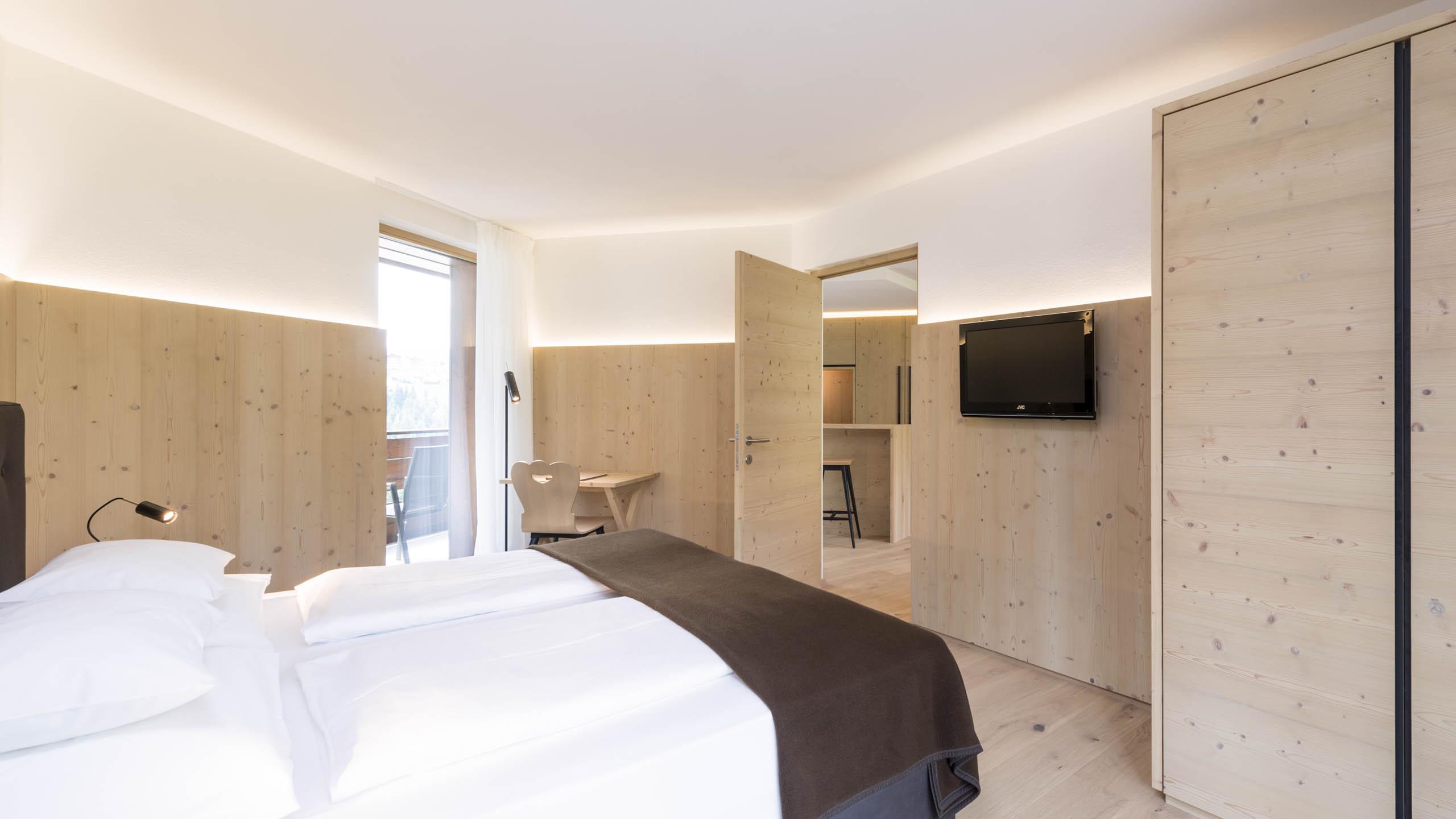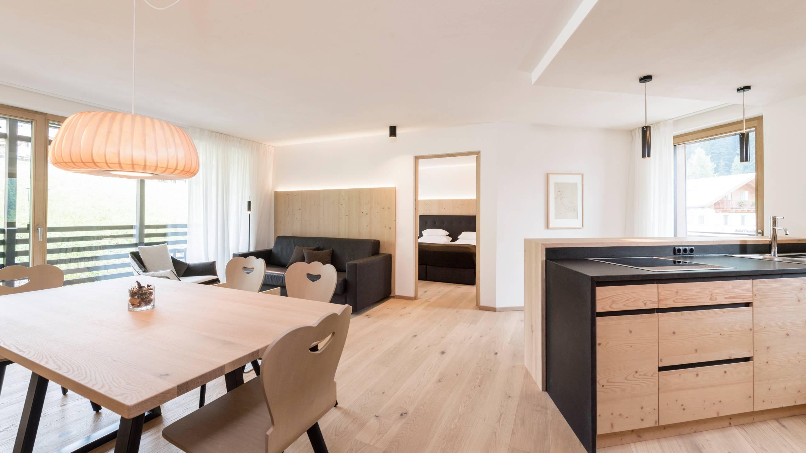- Il trilocale “Design” dei nostri appartamenti vacanze a Selva di Val Gardena è composto da un soggiorno open space con angolo cottura, due camere da letto, due bagni, un giardino o un balcone.
